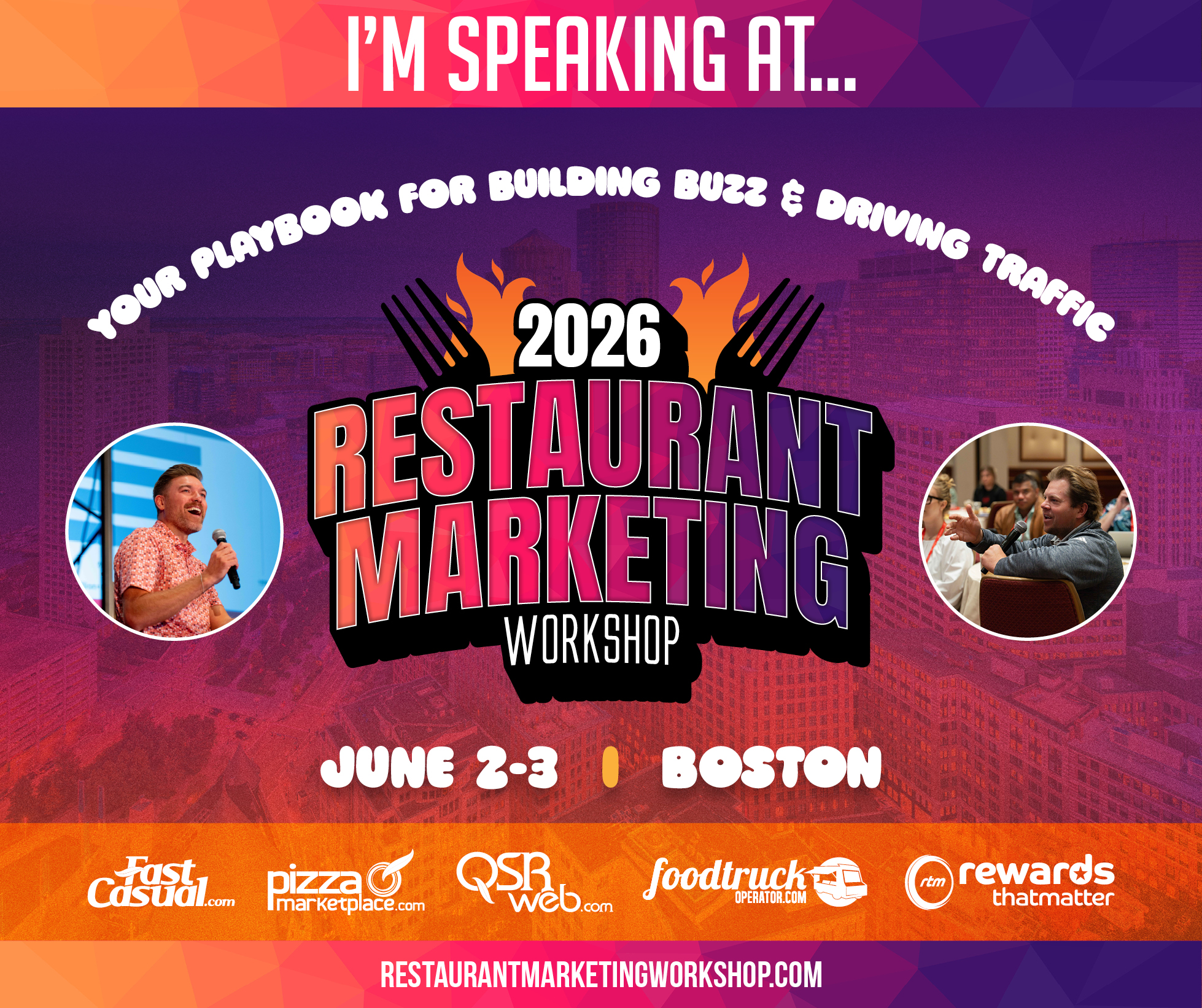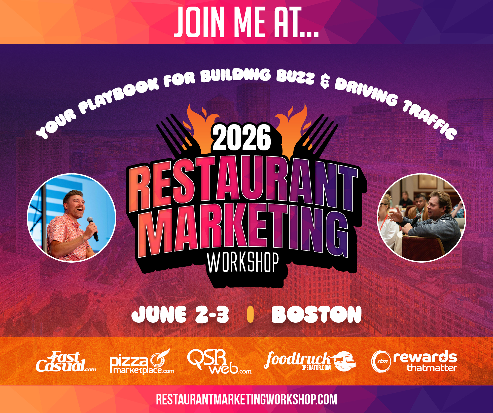 - I’m headed to Boston June 2-3 for the Restaurant Marketing Workshop! Ready to dive into the latest strategies for driving traffic and building brand buzz. #RMW2026